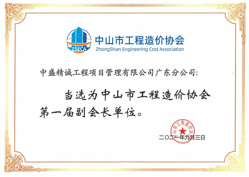 热烈祝贺中盛精诚工程项目管理有限公司广东分公司当选为中山市工程造价协会第一届副会长单位,同时被评为2021年度中山市工程造价协会先进会员单位。