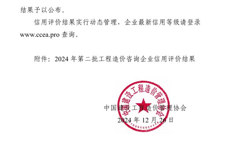 12月26日,中价协对2024年第二批工程造价咨询企业信用评价结果予以了公布,恭喜中盛精诚连续三界荣获3A级信用评价。