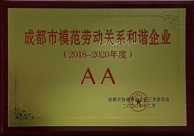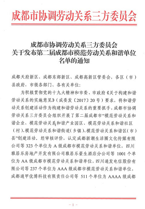 为贯彻落实《成都市第二届“五级联动”争创成都市模范劳动关系和谐单位评价工作的通知》要求,经成都市人民政府和成都市协调劳动关系三方委员会评选审定,授予中盛精诚工程项目管理有限公司“成都市模范劳动关系和谐企业AA级”的荣誉称号。