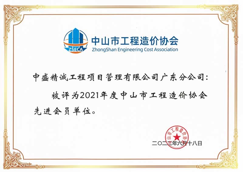 热烈祝贺中盛精诚工程项目管理有限公司广东分公司当选为中山市工程造价协会第一届副会长单位,同时被评为2021年度中山市工程造价协会先进会员单位。